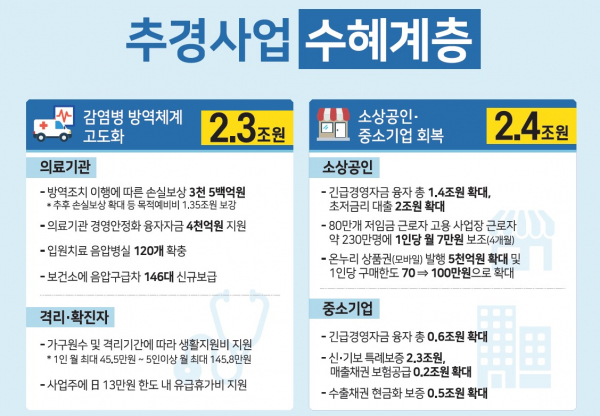정부는 4일 코로나19 피해 소상공인 회복지원에 사용할 2조 4,000억원을 포함해 총 11조 7,000억원 규모로 추가경정예산안을 의결했다. 2003년 사스로 불렸던 중증급성호흡기증후군 사태(4조2,000억원)와 2015년 메르스로 불렸던 중동호흡기증후군(11조 6,000억원) 사태보다 예산 규모가 커서 역대 감염병 대응 추경 가운데 최대 수준이다. 정부는 경제 비상시국이라는 인식 아래 긴급지원을 넘어 민생안정과 경제활력 보강에 전력투구하겠다는 방침을 마련했다.