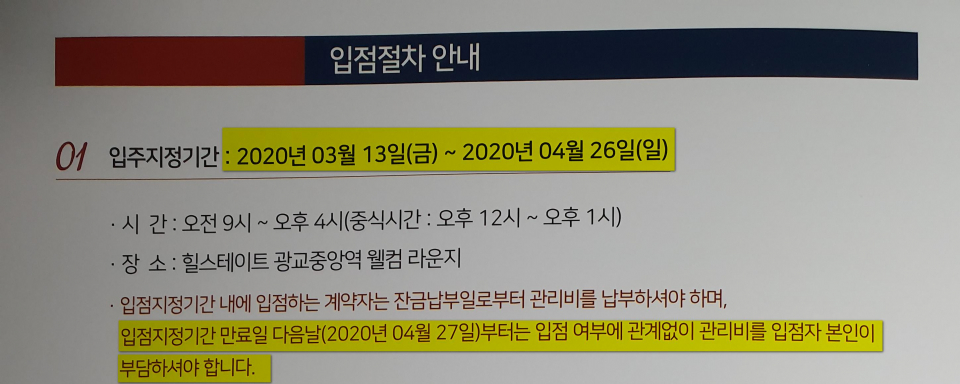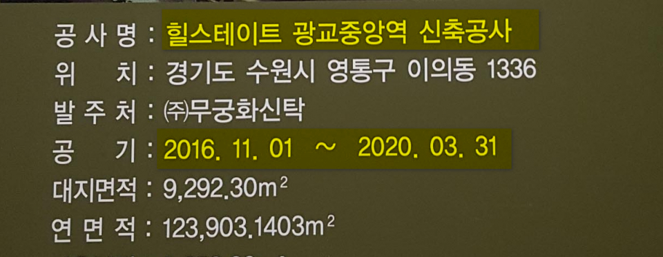 제보자는 힐스테이트 광교중앙역 공사장에 적힌 안내문을 제시했다. 시행사인 정원개발과 시공사인 현대건설이 예상한 공사기간이 2020년 3월 31일까지이므로 입주기간은 4월 1일부터 시작해야 한다고 주장했다.