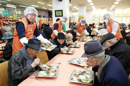 22일 한화그룹 서울?경인지역 신임 임원 33명은 서울 종로구 경운동 소재 서울노인복지센터를 방문, 노인 2,000여명을 대상으로 무료급식활동을 실시했다.