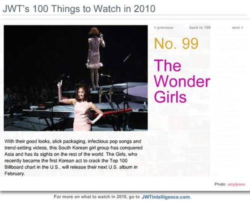 원더걸스가 JWT에서 선정한 '2010년에 주목 해야 할 100가지'에 선정됐다.