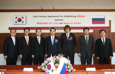 [소비자경제=구변경 기자] 빙그레는 러시아에 스낵 제품 생산 및 판매 법인을 설립하고자 5일 오전 10시 정동 본사에서 BDC GROUP社 대표 알렉세이 쿠릴로프(Alexey Kurilov)와 합작투자 조인식을 가졌다.