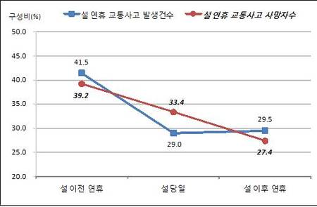 최근 3년간 설 연휴 교통사고는 5028건이 발생하여 118명이 사망하고 9957명이 다쳐, 1일 평균 419건이 발생, 10명이 사망하였다.