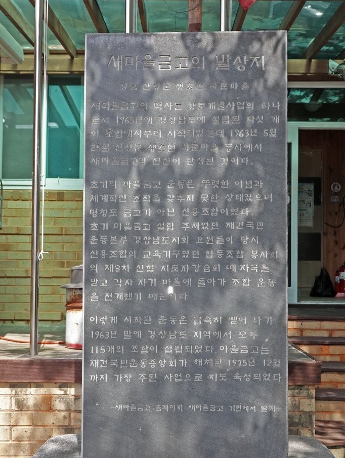 경상남도 산청군 생초면에서 1963년 창립된 새마을금고(당시 하둔신용조합)는 지역주민이 믿고 찾을 수 있는 토종금융협동조합이란 목표 아래 꾸준히 성장한 끝에 시중은행과 어깨를 나란히 할만큼 자산 규모를 키웠다. 새마을금고는 현재 3,200여 점포에서 총 2,046만명이 거래하는 금융협동조합으로 거듭났다.