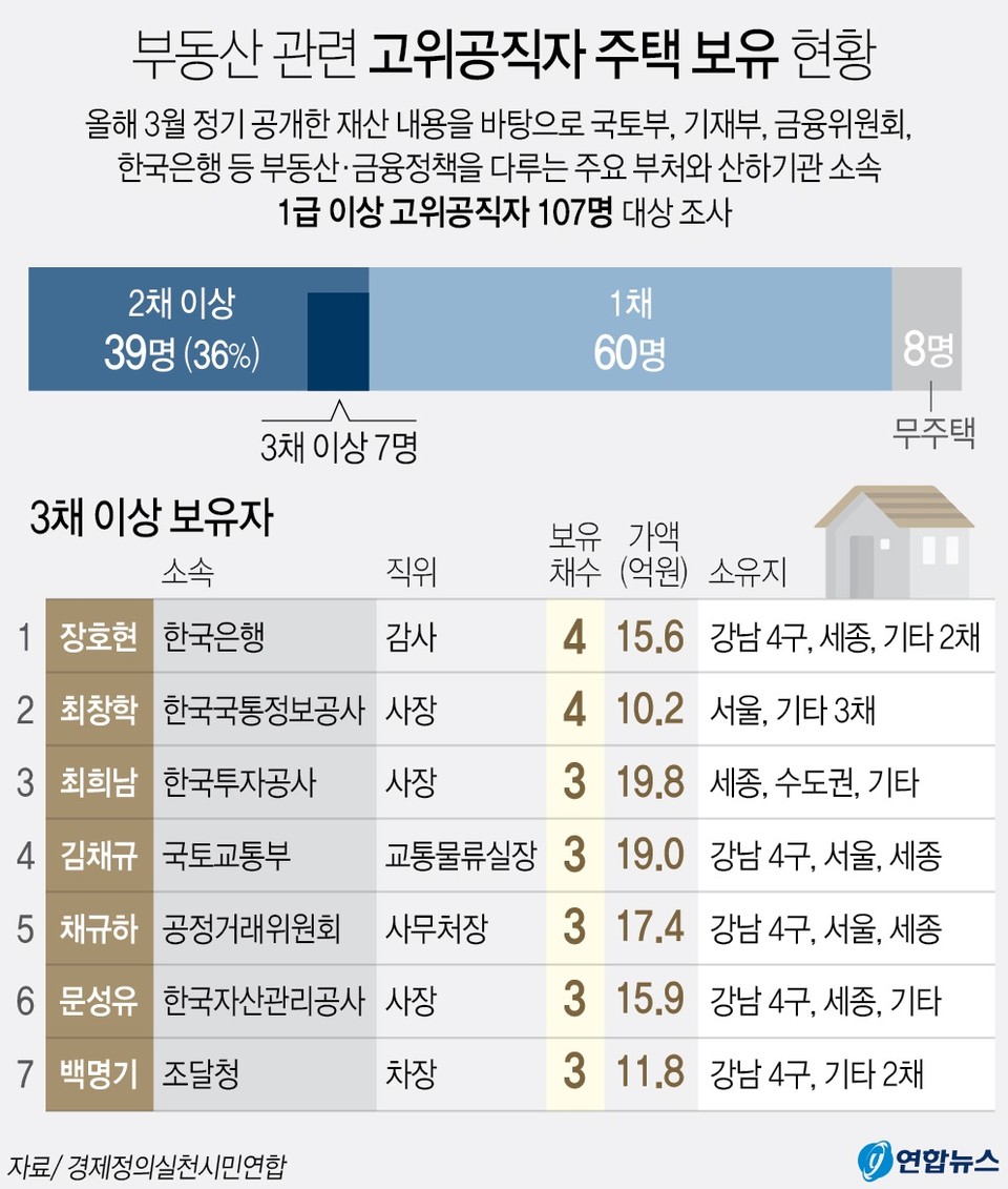 조사대상 107명 중 3주택 이상 보유자도 7명이나 되는 것으로 파악됐다. 장호현 한국은행 감사(4채), 최창학 당시 한국국토정보공사 사장(4채), 최희남 한국투자공사 사장(3채), 김채규 당시 국토교통부 교통물류실장(3채), 채규하 당시 공정거래위원회 사무처장(3채), 문성유 한국자산관리공사 사장(3채), 백명기 조달청 차장(3채) 등이 3채 이상 보유한 부동산 자산가다.