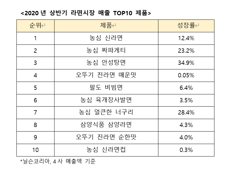 상반기 라면시장에서 1위를 수성한 제품은 ‘농심 신라면’이다. 이어 농심 짜파게티가 2위, 농심 안성탕면이 3위, 오뚜기 진라면 매운맛이 4위, 팔도 비빔면 5위, 농심 육개장 사발면이 6위, 농심 얼큰한 너구리가 7위, 삼양식품 삼양라면이 8위, 오뚜기 진라면 순한맛이 9위, 농신 신라면컵이 10위를 차지했다.