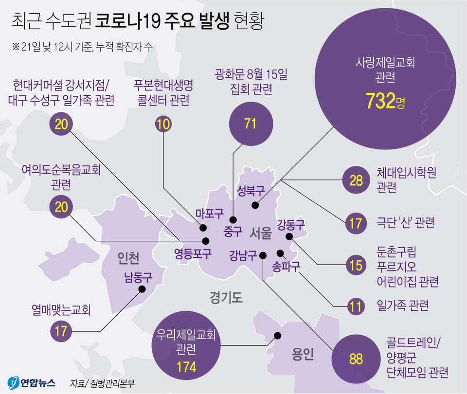 질병관리본부 중앙방역대책본부에 따르면 8월21일 0시 기준으로, 국내 발생 신규 확진자는 315명이 확인됐고 해외유입 사례는 9명이 확인되어 총 누적 확진자수는 1만 6,670(해외유입 2,697명)이다. 신규 격리해제자는 57명으로 총 1만 4,120명(84.71%)이 격리해제 되어 현재 2,241명이 격리 중이다. 위·중증 환자는 18명이며, 사망자는 2명으로 누적 사망자는 309명(치명률 1.85%)이다.
