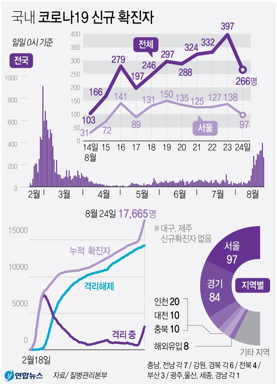 일일 신규 확진자는 수도권을 중심으로 한 집단감염이 본격화한 14일부터 일별로 103명→166명→279명→197명→246명→297명→288명→324명→332명→397명→266명을 기록하며 11일 연속 세 자릿수를 기록하고 있다. 이 기간 발생한 신규 확진자는 총 2895명으로 3000명에 육박한다. 이날 확진자 수가 줄어든 데는 휴일 검사 건수가 줄어든 영향도 있는 것으로 보인다. 이날 0시 기준 하루 검사 건수는 1만3236건으로, 전날(1만5386건)보다 2000여건 줄었고 평일인 21일(2만40건)과 22일(2만1677건)에 비해서는 크게 적었다.