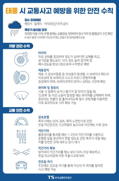 교통안전공단 권병윤 이사장은 “강풍을 동반한 폭우는 도로변 간판·현수막 등이 추락하거나 도로시설이 쓰러지는 등 예기치 못한 사고가 발생할 수 있기 때문에 운전자들의 각별한 주의가 필요하다. 강한 비·바람으로 인해 우산 등으로 시야를 가린 보행자 등을 고려하여 운전자는 전방주시에 더욱 노력해야 한다”고 당부했다.