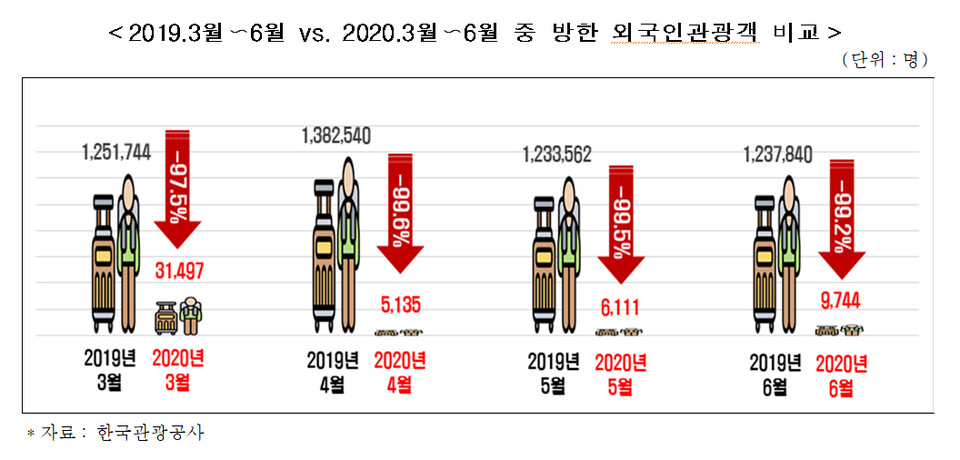 관광업계의 ‘코로나 그늘’이 더욱 짙어지고 있다. 올 3~6월 외국인관광객은 전년대비 99.0% 감소함에 따라 취업유발인원이 11만 9,000여명 줄었다. 생산유발액은 13조 2,000억원, 부가가치유발액도 6조 1,000억원 감소했다. 최악의 경영파탄을 맞고 있다.