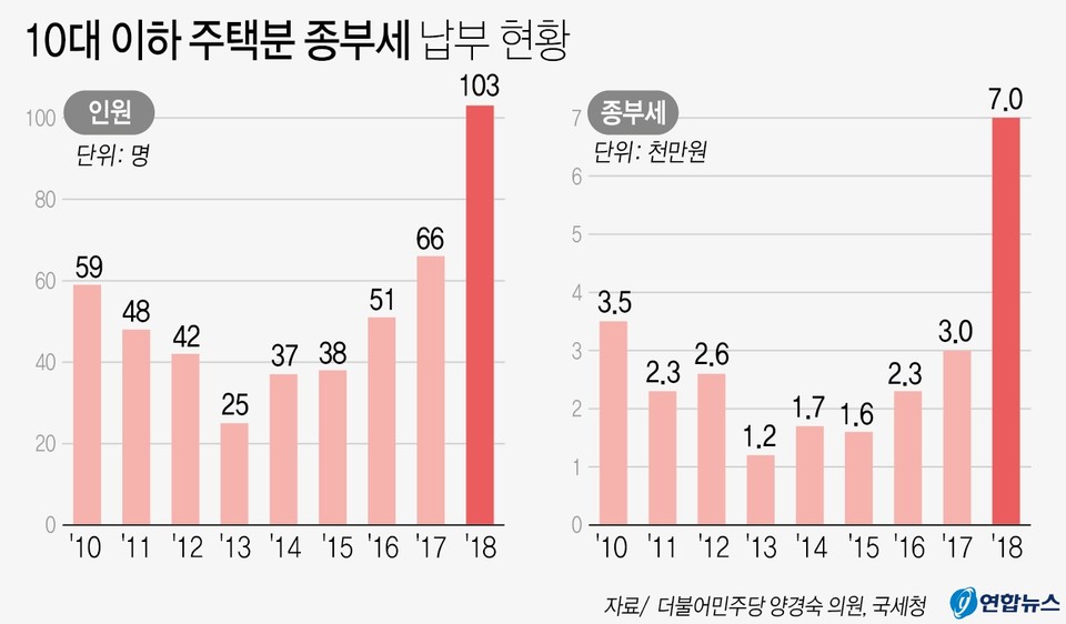 더불어민주당 양경숙 의원이 24일 국세청에서 받은 ‘10대 이하 과세유형별 결정현황’에 따르면 뚜렷한 소득원천이나 경제적 능력이 없는 10대 이하 주택분 ‘종합부동산세’ 납부 인원은 2010년 59명에서 점차 줄어 2013년 25명을 기록했다. 2014년부터 지속적인 증가추세를 보이다 2018년 103명을 기록했으며 총 7000만원의 종부세액을 부담했다.