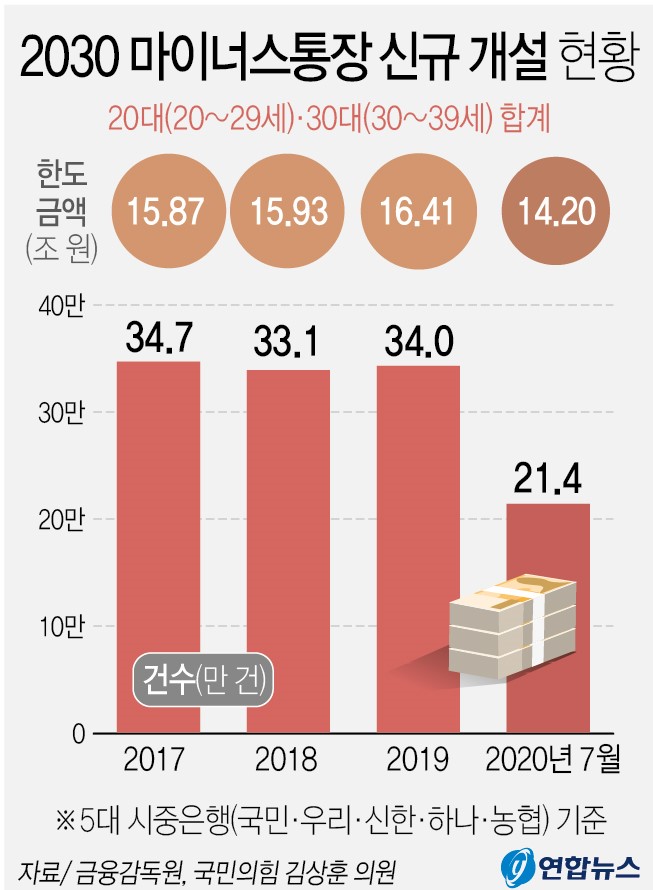 국회 국토교통위원회 소속 국민의 힘 김상훈 의원이 지난 4일 금융감독원의 발표를 인용하여 발표한 시중 5대 은행(국민, 하나, 우리, 신한, 농협)의 마이너스통장 개설 현황 자료에 따르면 20대와 30대의 마이너스통장 한도액이 총 62조 4056억원에 달했다. 연도별로는 2017년 15조 8659억원, 2018년 15조 9281억원, 2019년 16조 4105억원으로 계속 늘어났으며 올해는 7월 기준 14조 2011억원에 이르렀다. 특히 20대의 마이너스통장 한도액도 2017년 2조 2572억원, 2018년 2조 3784억원에서 지난해 2조 6326억원으로 확대됐다.