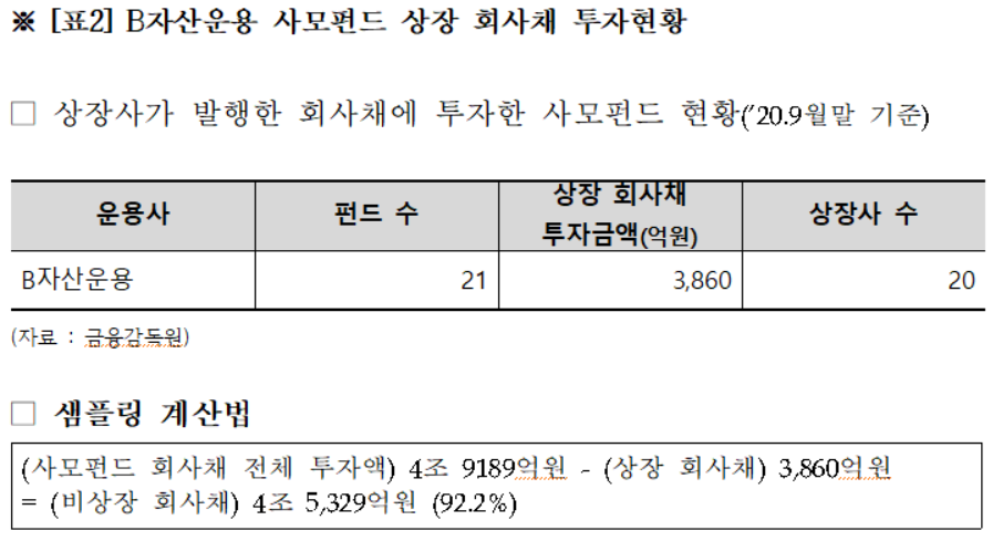 이정문 의원실은 사모펀드 회사채 투자 자산운용사 중 투자금액 수조원대 최상위 그룹에 속하는 운용사 한 곳의 자료를 받아 샘플링한 결과 비상장사가 발행한 회사채에 투자한 금액의 비중이 92.2%에 달했다고 밝혔다. 이는 전체 사모펀드 회사채에 적용해보면 89조원 중 81.9조원이 비상장 회사채에 투자된 것으로 추정된다.