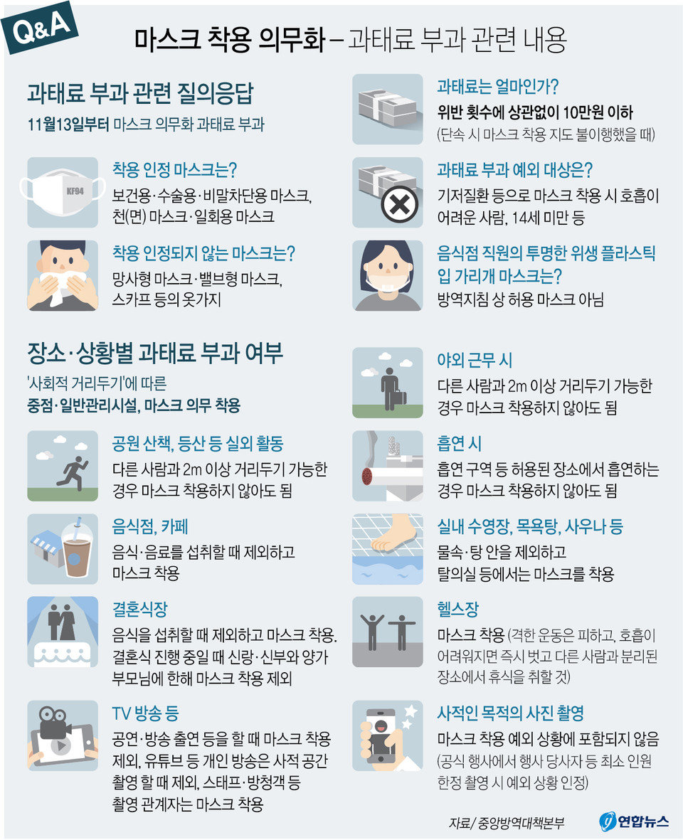 만 14세 미만, 도움 없이 마스크 착용이 어려운 사람, 기저질환(지병)을 앓고 있는 사람은 과태료 부과 대상에서 제외된다. 마스크 착용 의무화 불이행 시 과태료 부과 관련 중요사안을 Q&A 형식으로 정리해봤다.