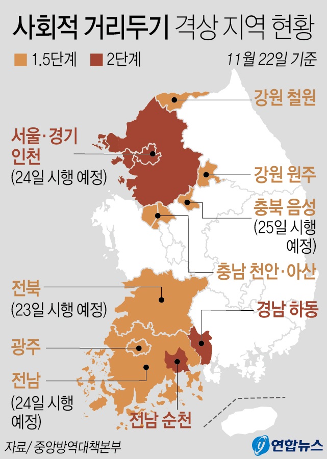 중대본은 “(거리두기 단계 격상은) 다음달 3일 예정된 수능 시험 전에 코로나19 환자 증가 추세를 반전시키고, 겨울철 대유행을 선제적으로 차단하기 위함”이라며 “지자체별로 지역 특성에 따라 적용 시점 및 범위, 조치 내용 등을 보다 강화하거나 완화하는 등 탄력적으로 조정할 수 있다”고 전했다.
