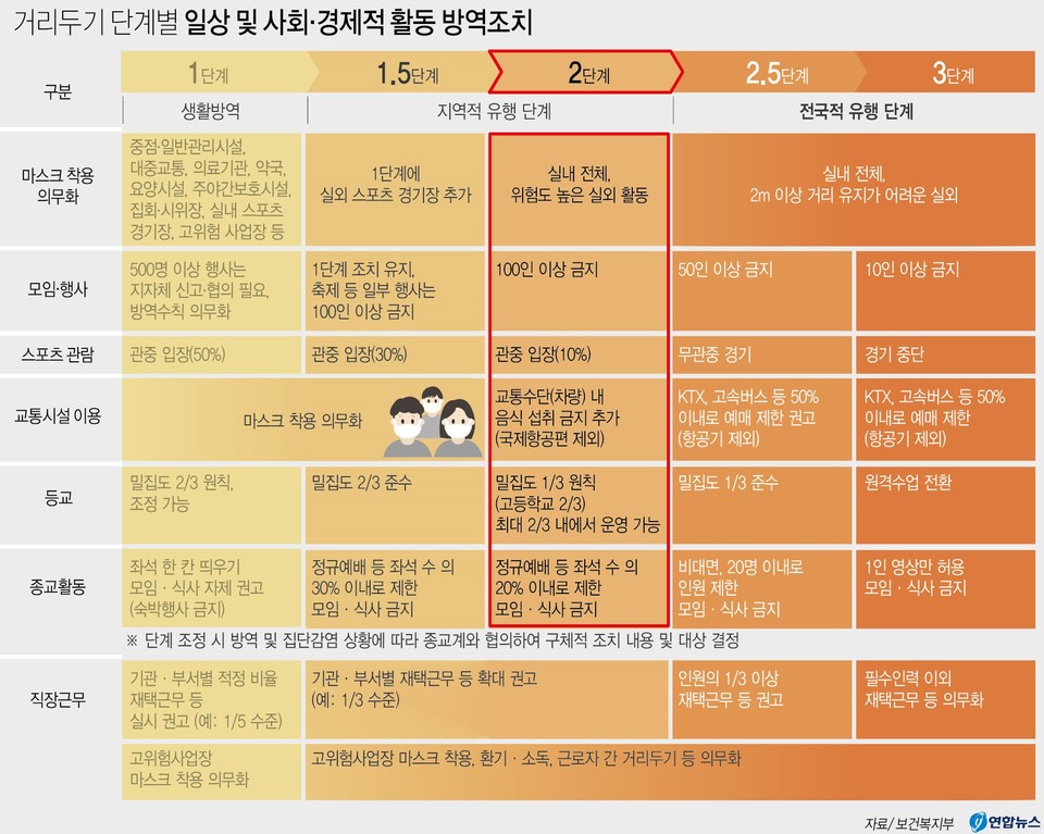 스포츠 관람은 경기장별 최대 수용 가능 인원의 10%로 관중 입장이 제한된다. 등교는 밀집도 1/3을 원칙(고등학교는 2/3)으로 하되 탄력적 학사 운영 등으로 최대 2/3 내에서 운영할 수 있다.