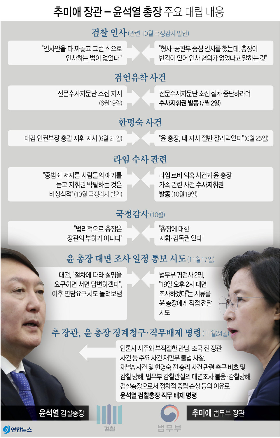 그러나 야당은 윤 총장 찍어내기에 반발했다. 국민의힘 주호영 원내대표는 “추 장관의 폭거도 문제지만 뒤에서 묵인하고 어찌 보면 즐기고 있는 문 대통령이 더 문제다”면서 “마음에 안 들면 본인이 정치적 책임을 지고 해임하든지 하라”고 촉구했다. 이 월권이라며 대통령의 뜻인지 밝히라고 요구했다. 국민의힘은 25일 법사위 개최를 추진했으나 민주당 반대로 무산됐다.