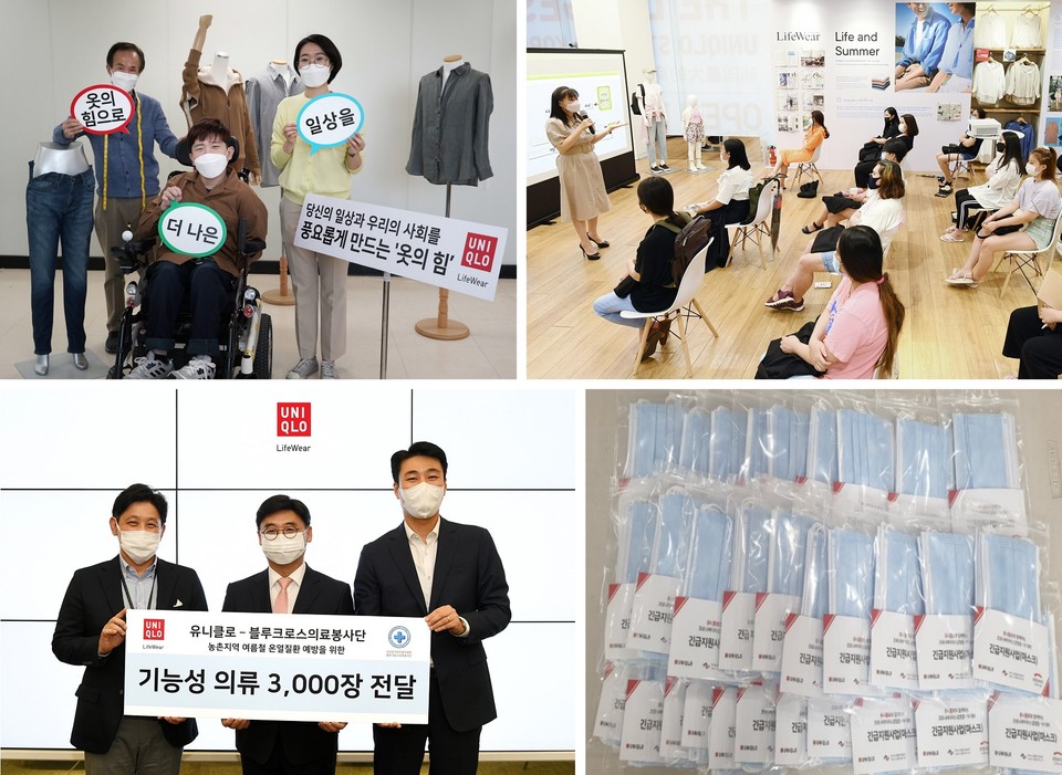 유니클로는 코로나19 발생 초기 대구지역 내 취약계층 아동 및 관련 시설 근무자를 위해 대구아동복지협회에 마스크 1만 5000장을 지원했고 희망브리지를 통해 경북지역 의료진을 돕고자 약 1억 7000만원 상당의 구호 성금과 기능성 이너웨어를 전달했다. 이후 강원지역 아동을 위해 지역아동센터강원지원단에 마스크를 추가로 지원했다.