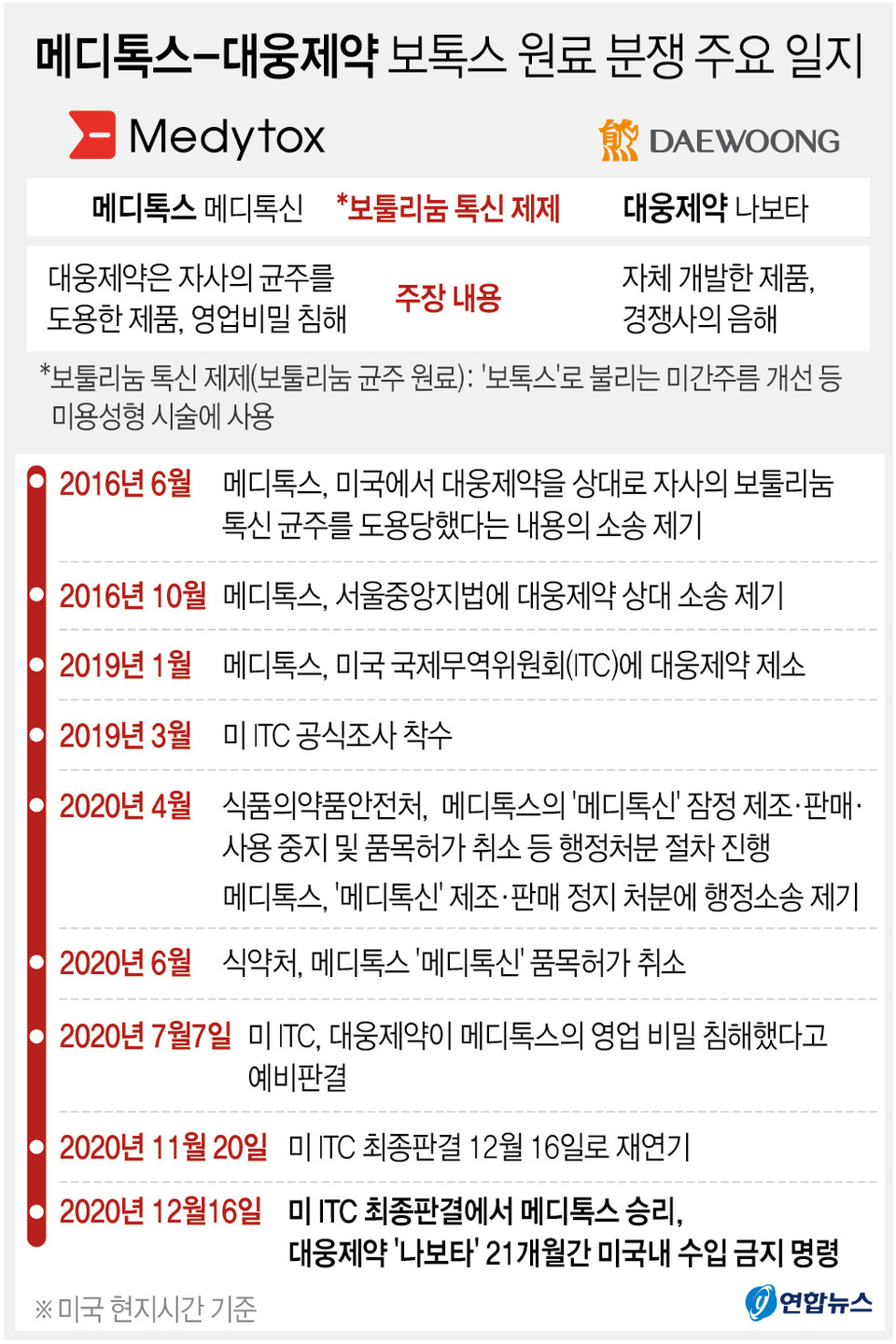 메디톡스는 대웅제약이 자사의 균주와 제조공정 기술문서 등을 훔쳐 갔다고 보고, 지난해 1월 ITC에 영업비밀 침해 혐의로 공식 제소했다. ITC는 올해 7월 예비판결에서는 대웅제약이 메디톡스의 영업비밀을 침해했다고 보고 나보타를 10년간 수입 금지해야 한다고 권고했다.