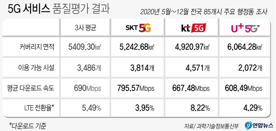 이동통신 3사 가운데 5세대(5G) 이동통신 속도는 SK텔레콤이 가장 빨랐고 LG유플러스는 가장 많은 커버리지를 확보했다. KT는 실내 시설 구축에서 가장 앞섰다.