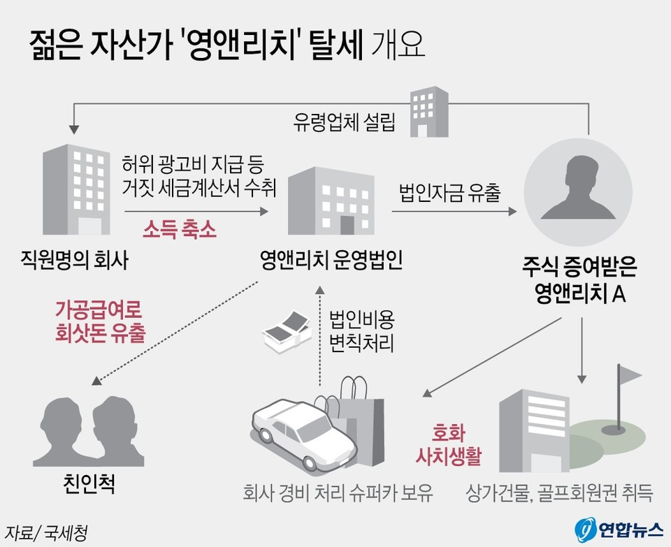 1000억원이 넘는 재산을 보유한 사주 A는 회사의 이익이 급증하자 배우자 명의로 페이퍼컴퍼니를 설립해 법인자금을 변칙적으로 유출하고 자녀가 10대 일 때부터 약 150억원을 편법으로 증여했다. 이른바 영앤리치(Young&Rich)인 자녀는 뚜렷한 소득원도 없이 서울 초고가 주택에 거주하면서 법인비용으로 슈퍼카(3대, 13억원)를 몰고 해외여행 등 호화·사치생활을 영위한 혐의를 받고 있다.