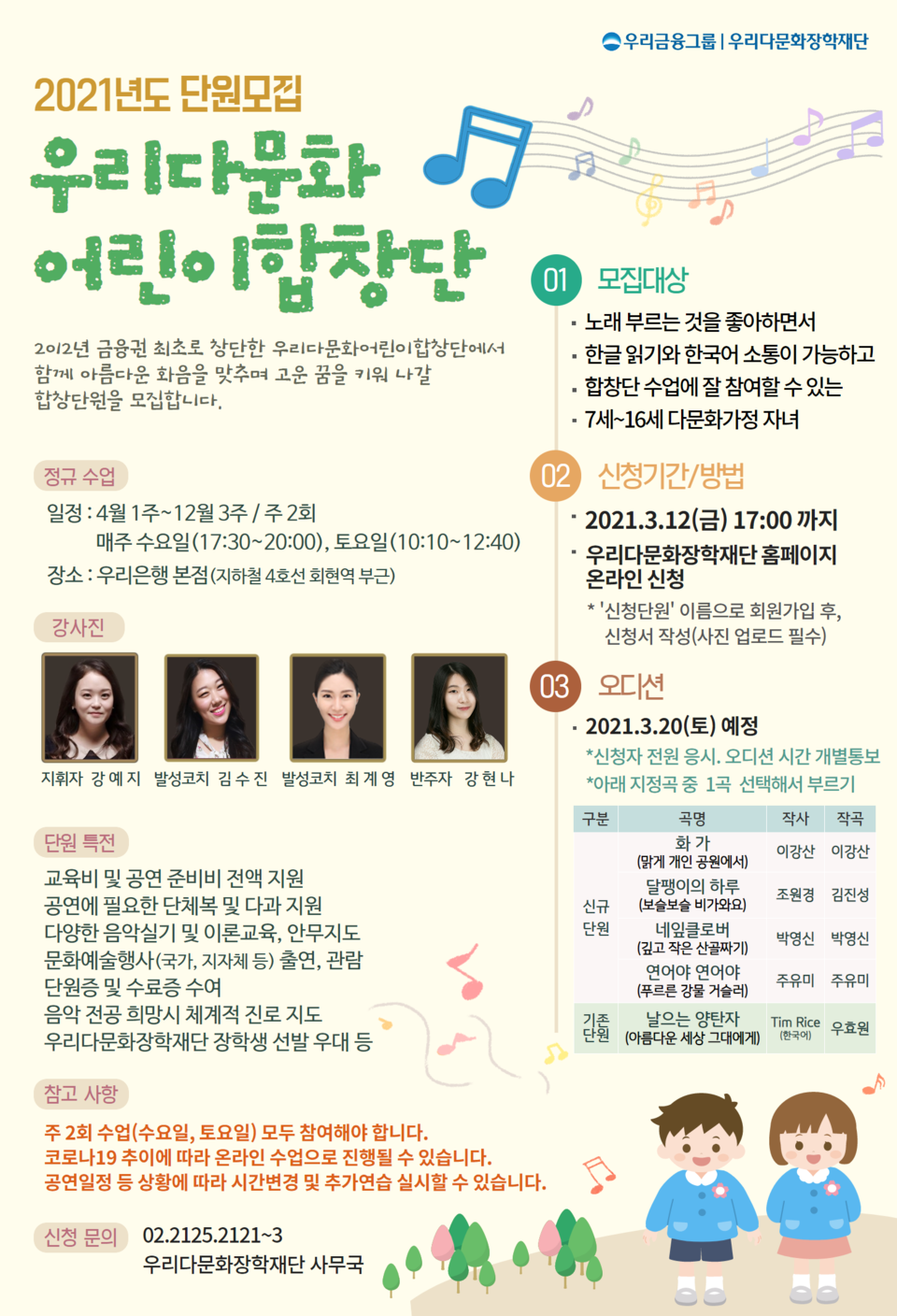 합창단원 신청대상은 노래를 좋아하고 음악에 소질이 있는 7세~16세 다문화자녀다. 이달 12일까지 우리다문화장학재단 홈페이지 신청한 후 오디션을 통해 최종 40명이 선발된다. 정규수업은 매주 수요일과 토요일에 우리은행 본점에서 진행되며 사회적 거리두기 지침에 따라 온·오프라인을 병행해 안전을 고려한 수업이 운영될 예정이다.