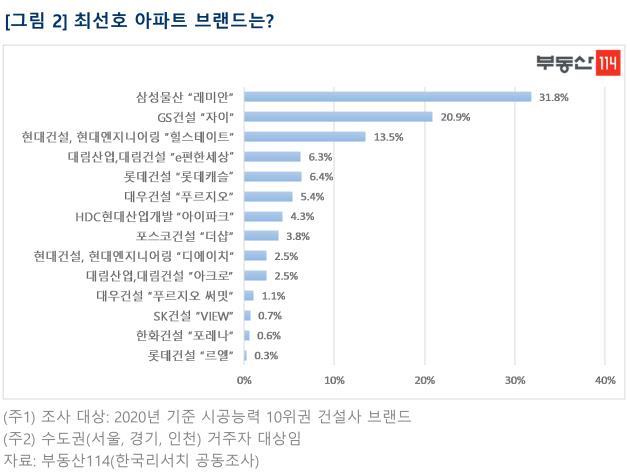 최선호 아파트 브랜드에서도 래미안이 31.8%의 응답률로 1위를 기록했고 GS건설 자이가 20.9%로 2위를 차지했다. ▲현대건설·현대엔지니어링의 ‘힐스테이트’(13.5%) ▲DL이앤씨·DL건설의 ‘e편한세상’(6.3%) ▲롯데건설의 ‘롯데캐슬’(6.4%) ▲대우건설의 ‘푸르지오’(5.4%)등이 그 뒤를 이었다.
