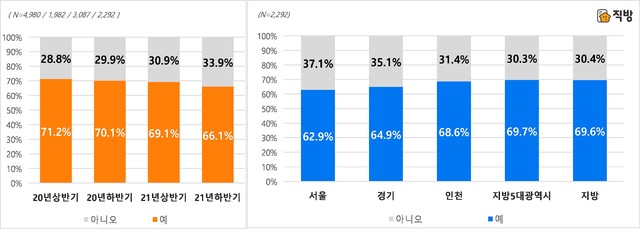 직방은 애플리케이션 이용자를 대상으로 진행해 총 2292명이 참여한 가운데 66.1%(1514명)가 올해 하반기에서 내년 상반기 기간 내에 주택을 매입할 계획이 있다고 응답했다. 이는 조사를 시작한 작년 상반기 이후 꾸준히 매입 계획 비율이 소폭 줄어든 수치다.