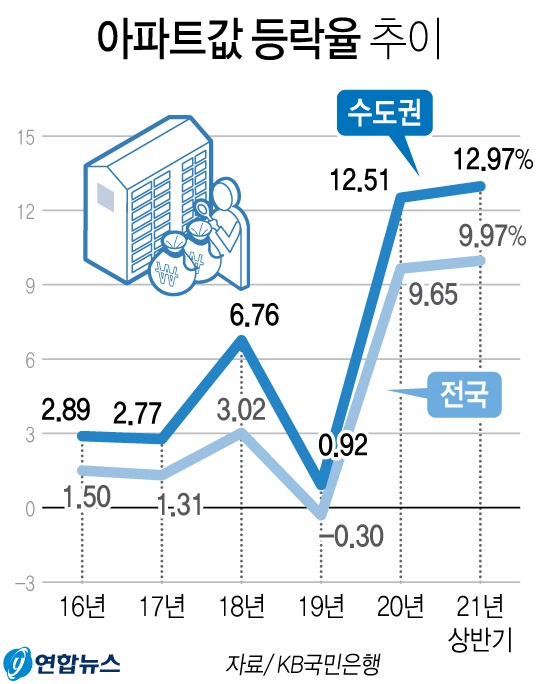 5일 KB국민은행 월간 주택가격 동향 시계열 통계에 따르면 올해 상반기 전국 아파트값은 9.97% 올랐다. 이는 지난해 연간 상승률(9.65%)을 넘어선 수치다. 수도권 아파트값의 경우 12.97% 올라 역시 지난해 연간 상승률(12.51%)를 넘어섰다. 상반기 기준 16.48%의 상승률을 기록했던 2002년 이래 19년 만에 최고 상승률이다.