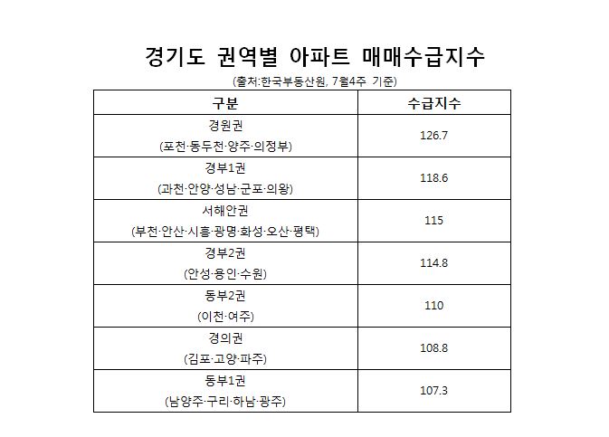 최근에는 경원권(포천·동두천·양주·의정부)의 아파트 매수심리가 강세를 보이고 있다. 한국부동산원의 ‘아파트 수급동향’ 자료에 의하면 경원권 아파트 매매수급지수(7월4주 기준)가 126.7로 경기도 내에서 가장 높은 수치를 기록했다. 이어 경부1권(118.6), 서해안권(115), 경부2권(114.8) 등 순이었다. 매매수급지수는 부동산원의 회원 중개업소 설문과 인터넷 매물 건수 등을 분석해 수요와 공급 비중을 지수화한 것으로 ‘0’에 가까울수록 공급우위, 200에 가까울수록 수요우위로 해석된다.