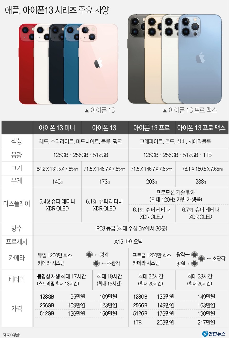색상은 새로 출시된 핑크색을 포함해 블랙, 화이트, 레드, 블루 등 5가지로 출시된다. 가격은 국내 출고가의 경우 아이폰13미니는 95만원, 아이폰13은 109만원, 아이폰13프로 135만원, 아이폰13프로맥스 149만원이다. 아이폰13프로맥스 1TB 모델은 217만원이다.