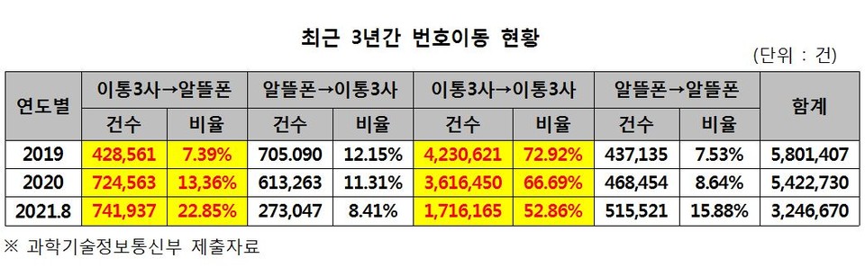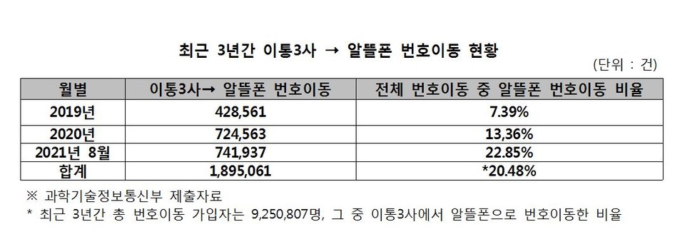 1일 국회 과학기술정보방송통신위원회 김상희 국회부의장이 과학기술방송통신부에서 제출받은 자료에 따르면 최근 3년간 이통3사에서 알뜰폰으로 번호이동한 가입자 수가 계속 증가하고 있는 것으로 나타났다. 2019년 42만 8561명에서 2021년 8월까지 74만 1937명으로 약 73%가 증가했고 전체 번호 이동 중 알뜰폰이 차지하는 비율 역시 7.39%에서 22.85%로 3배 이상 증가했다.