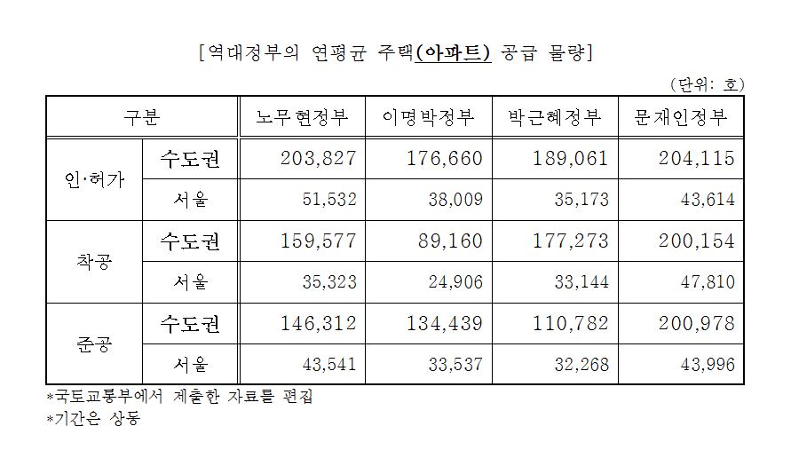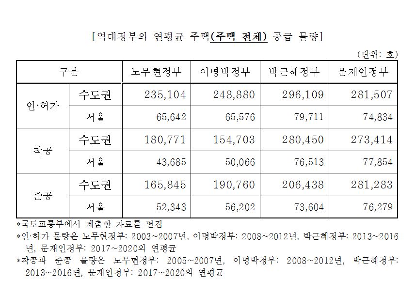단독주택·다세대주택·연립주택 등을 제외한 아파트로만 범위를 좁히면 이러한 경향은 더 강해졌다. 문재인정부(2017~2020년)의 수도권 연평균 아파트 공급물량은 인·허가 20만 4000건, 착공 20만건, 준공 20만 1000건으로 노무현정부(인·허가 20만 4000건, 착공 16만건, 준공 14만 6000건), 이명박정부(인·허가 17만 7000건, 착공 8900건, 준공 13만 4000건), 박근혜정부(인·허가 18만 9000건, 착공 17만 7000건, 준공 11만 1000건)보다 훨씬 많았다.