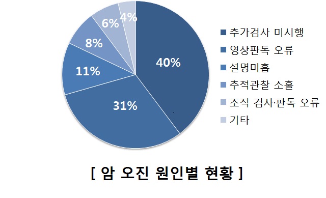 암 오진 사례 중 병원 책임이 인정된 78건의 원인을 분석한 결과, 정확한 진단을 위해 추가검사가 필요했으나 이를 시행하지 않은 ‘추가검사 미시행’이 39.7%(31건)를 차지했다.