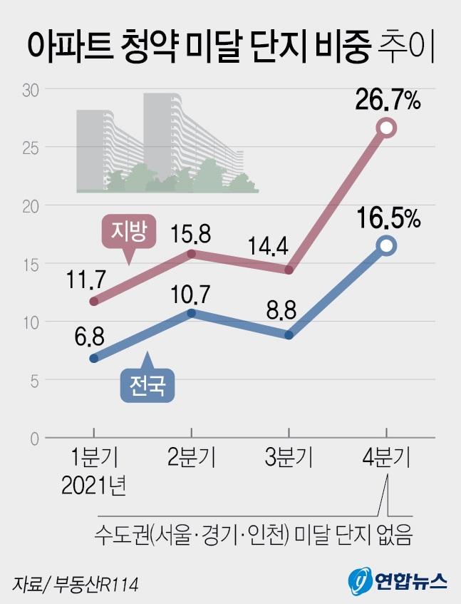 이는 서울, 수도권과 공공택지에서 분양되는 아파트가 여전히 높은 경쟁률로 마감되는 것과 대조적이다. 부동산R114 조사에 따르면 지난해 4분기 전국에서 분양된 707개 단지 가운데 미달이 발생한 단지는 총 117곳으로 전체의 16.5%에 달했다. 이는 569개 청약 단지 가운데 50개가 미달된 지난해 3분기(8.8%)에 비해 청약 미달 단지 비중이 2배가량 커졌다.