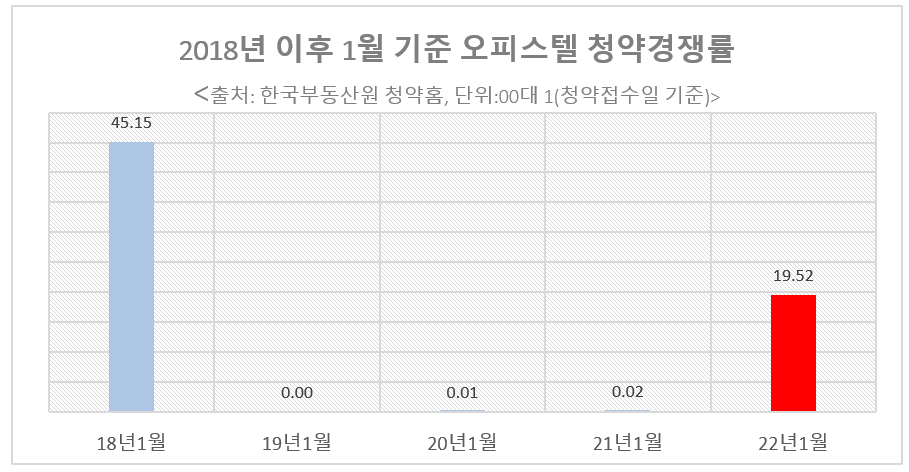특히 지난 해 전체 평균경쟁률인 26.53대 1에는 못 미쳤지만 1월이 전형적인 계절적 비수기임을 감안하면 상당히 선전한 셈이다. 지난 해 1월엔 단 2곳에서 1223실만이 공급됐으며 청약건수도 26건에 그쳤다. 올해 1월 청약건수가 지난해 동월 대비 약 1319배가 늘어난 셈이다. 또 2019년 이후 2021년까지 3년간 평균경쟁률은 거의 ‘0’에 가까웠다. 아파트 등 공동주택에 비해 상대적으로 규제가 덜하기 때문으로 풀이된다.