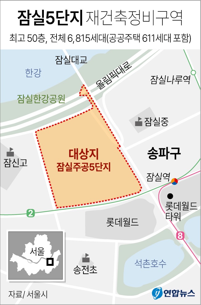 잠실5단지(송파구 잠실동 27번지 일대 총 35만 8077㎡)는 1978년도에 건립돼 올해로 준공 45년을 맞은 송파구 최대 재건축 단지다. 2014년 재건축 사업 준비에 착수했으나 2017년 도시계획위원회 심의 이후 학교용지 확보와 관련한 시와 조합 측의 이견으로 교육환경평가 심의가 3년 이상 지연지면서 사실상 사업이 중단된 상태였다.