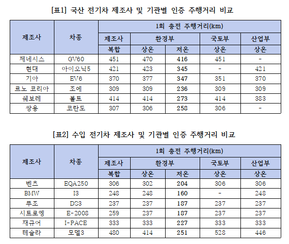 다만 조사 결과에서 일부 완성차 업체는 상온·저온 주행가능거리 모두 표기하는 업체도 있었다.
