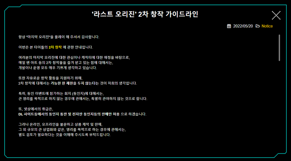 최근 국내에서 서비스 중인 모바일 수집형RPG 라스트오리진의 개발사 스마트조이가 트위터를 통해 흥미로운 공지를 했다. 일본의 DLsite 등에서 저작권을 이유로 판매를 중지시킨 2차 창작 저작물에 대해 직접적인 가이드라인을 제시한 것이다. 이 때문에 2차창작 저작물의 판매 정지가 풀렸고, 일본 현지에서 수많은 일러스트레이터에게 긍정적인 반응을 얻고 있다.