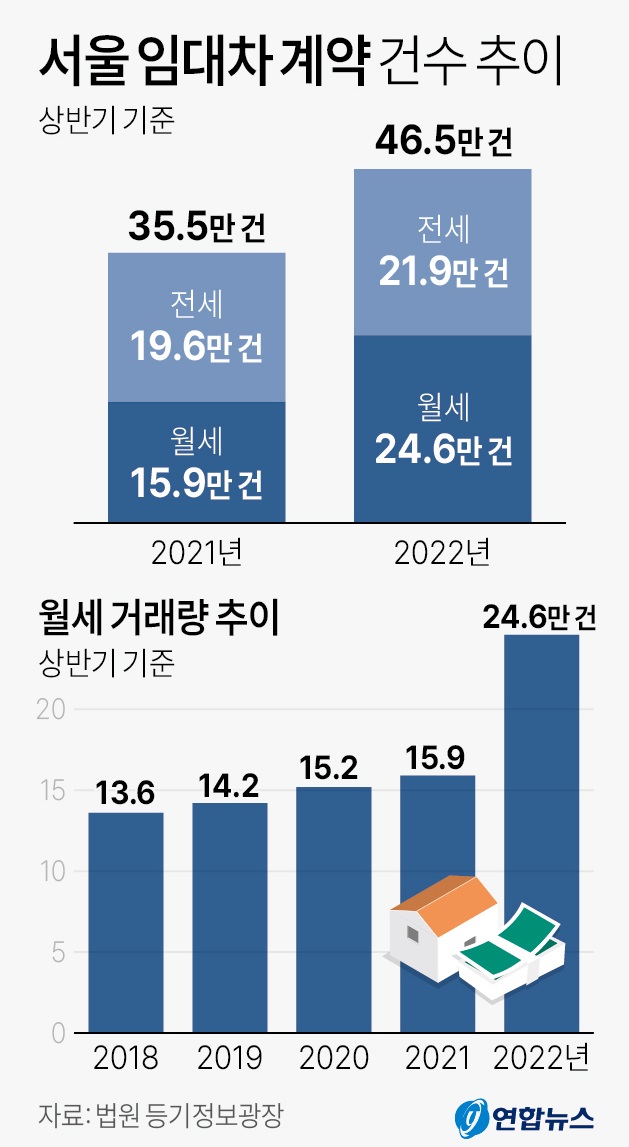 실제로 월세 거래량은 올해 상반기 24만 6064건으로 지난해 동기(15만 8546건)보다 55% 넘게 증가하면서 역대 최고치를 경신했다. 상반기 기준 월세 거래량은 2018년 13만 6266건→2019년 14만 1929건→2020년 15만 1501건→2021년 15만 8546건에 이어 올해까지 4년 연속 증가세를 기록했다.