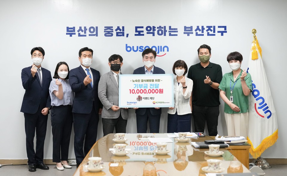 이랜드재단이 부산 진구청과 함께 하절기 노숙인 무료급식지원 및 조리실 개보수를 위한 기부금 전달식을 진행했다고 27일 밝혔다.