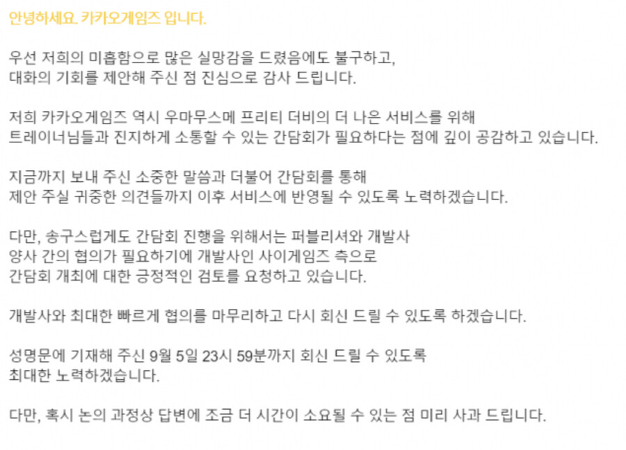 유저대표단은 4일 저녁 ‘카카오게임즈가 간담회를 진행하자고 연락했다’고 공지를 통해 밝혔다.  함께 공개된 메일 내용에 따르면 카카오게임즈는 “많은 실망감을 드렸음에도 불구하고 대화의 기회를 제안해주신 점 감사드린다”면서 “사이게임즈 측으로 간담회 개최에 대한 긍정적인 검토를 요청하고 있다. 성명문(최후통첩문)에 기재된 시간까지 회신드릴 수 있도록 최대한 노력하겠다”고 전했다.