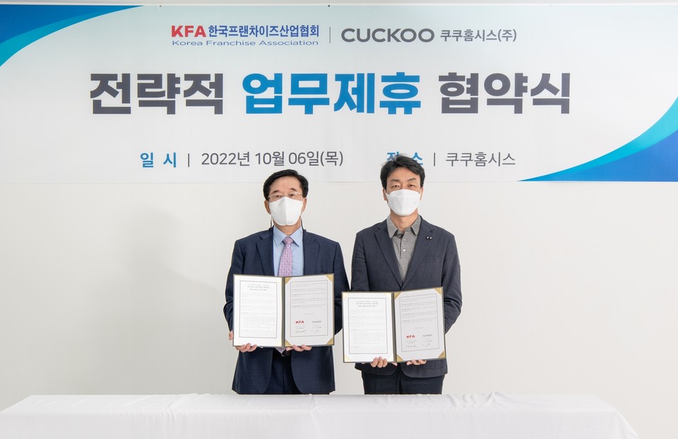 쿠쿠홈시스가 지난 6일 사단법인 한국프랜차이즈협회와 KFA 회원사 대상 렌털 제품 특판 적용을 위한 업무협약(MOU)을 체결했다고 7일 밝혔다.