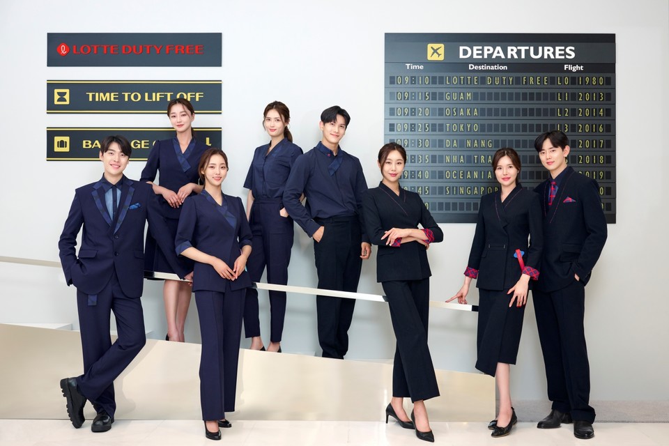 특히, 롯데면세점은 외국인 고객들에게 한국 전통의 미를 알릴 수 있도록 한복을 재해석해 유니폼 디자인에 적용했다. 옷깃과 소매 등에 한복의 특징을 살리고, 롯데면세점의 비주얼아이덴티티 패턴을 활용해 포인트를 줬다.