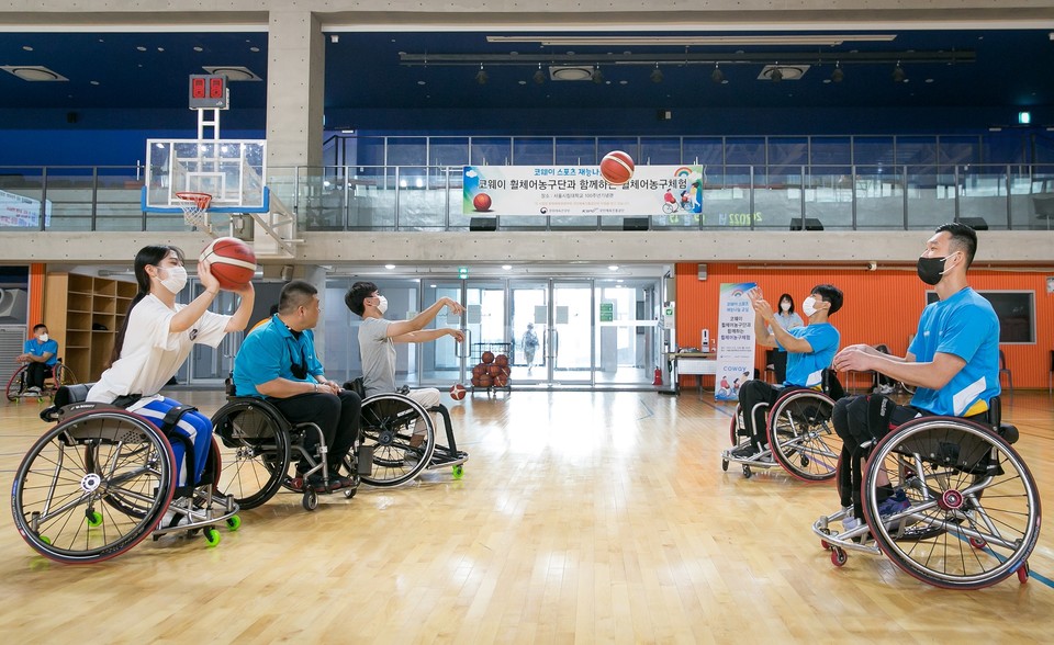 휠체어농구 체험활동에서는 코웨이 휠체어농구단 선수들이 직접 강사로 나서 비장애인들에게 생소할 수 있는 휠체어농구 종목 소개와 경기 규칙 등을 설명했다.