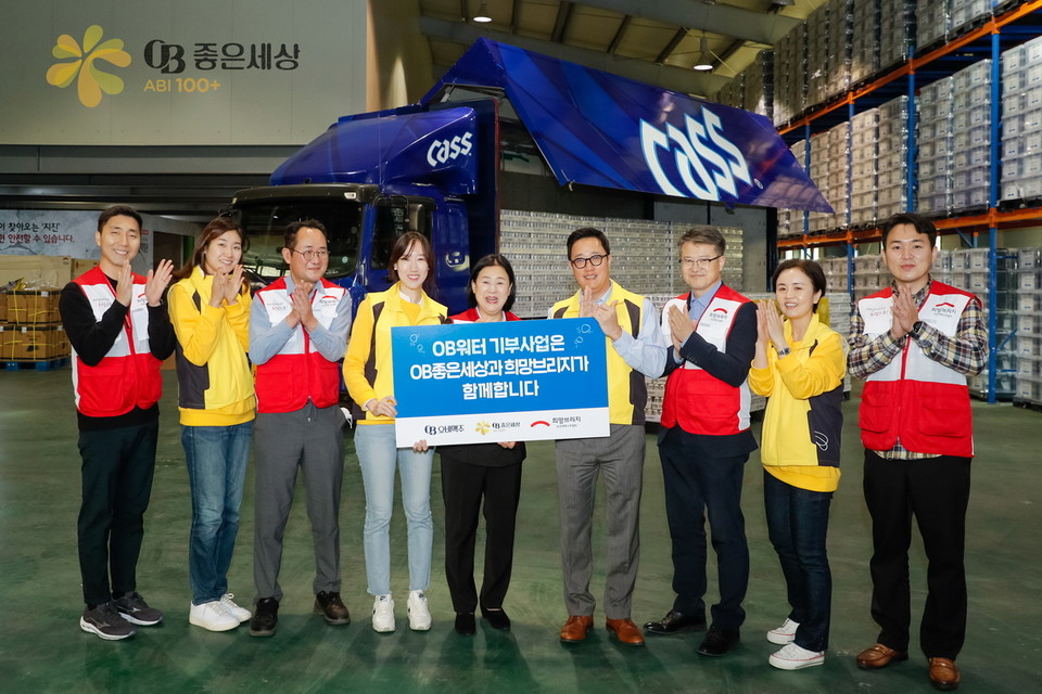 오비맥주는 26일 희망브리지 파주재해구호물류센터에서 구자범 법무정책홍보부문 부사장과 희망브리지 전국재해구호협회 김정희 총장 등이 참석한 가운데 OB워터 기증행사를 열었다.