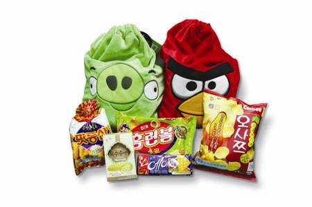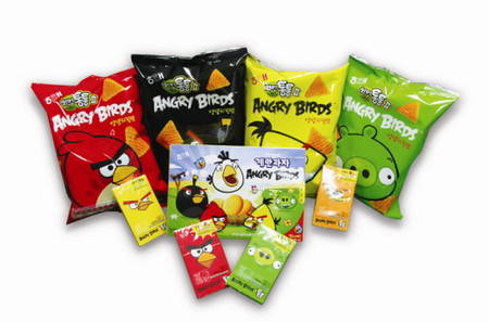 해태제과가 국내 제과업계 최초로 게임 개발사인 로비오사와 캐릭터 사용권을 독점 계약해 출시한 앵그리버드 과자와 아이스크림은 ‘계란과자 앵그리버드’(비스킷), ‘치킨통통Ⅱ 앵그리버드’(스낵), ‘앵그리버드통통’(껌)과 ‘앵그리버드 소다맛과 코코아맛’(아이스크림) 등 모두 5종이다. 이들 제품의 패키지는 앵그리버드 게임의 그린피그, 레드버드, 블랙버드, 엘로우버드 등 귀여운 주인공들의 캐릭터 특성을 살린 강렬한 색감과 디자인으로 시선을 사로잡는다.