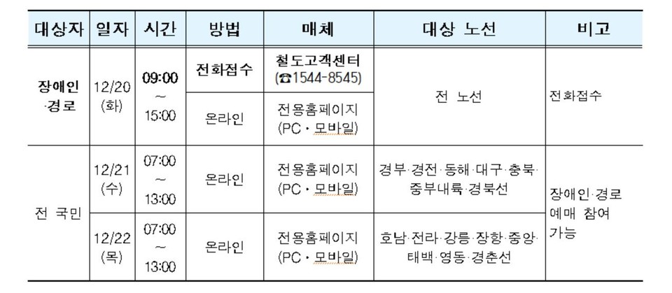 코레일은 오는 20∼22일 사흘간 온라인과 전화 등 100% 비대면 방식으로 사전 판매한다. 예매대상은 오는 2023년 1월 20∼24일 5일간 운행하는 KTX·ITX-새마을·무궁화호 열차 등이다.