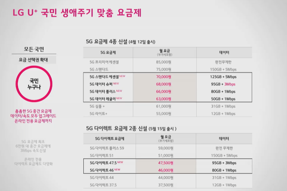 또 공식 온라인 스토어인 유플러스닷컴에서 가입할 수 있는 ‘5G 다이렉트’ 요금제 2종도 오는 5월 15일 출시된다. 기본 데이터 제공량은 각각 80GB·95GB으로, 요금은 일반 요금제보다 30% 저렴한 월 4만 6000 원과 월 4만 7500원에 판매된다.