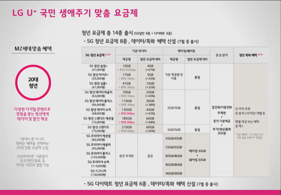 만 29세 이하 이용자 대상으로 하는 ‘5G 청년 요금제’ 14종은 오는 7월 3일부터 신설된다.