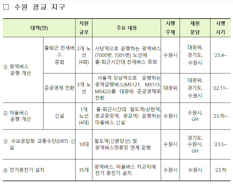 수원 광교지구는 출퇴근과 통학 등 다양한 광역교통 수요가 발생하고 있으나, 신분당선 연장사업 지연 및 지구 내 대중교통 사각지대로 인한 광역교통 불편이 지적된 바 있다. 이에 대광위는 광역버스 확충을 통해 지구 내 광역교통수단을 확보하는 한편, 마을버스 운행 개선과 수요응답형 교통수단(DRT) 신설 등을 통해 인근 도시철도 및 광역버스 정류장으로의 연계를 강화할 계획이다.